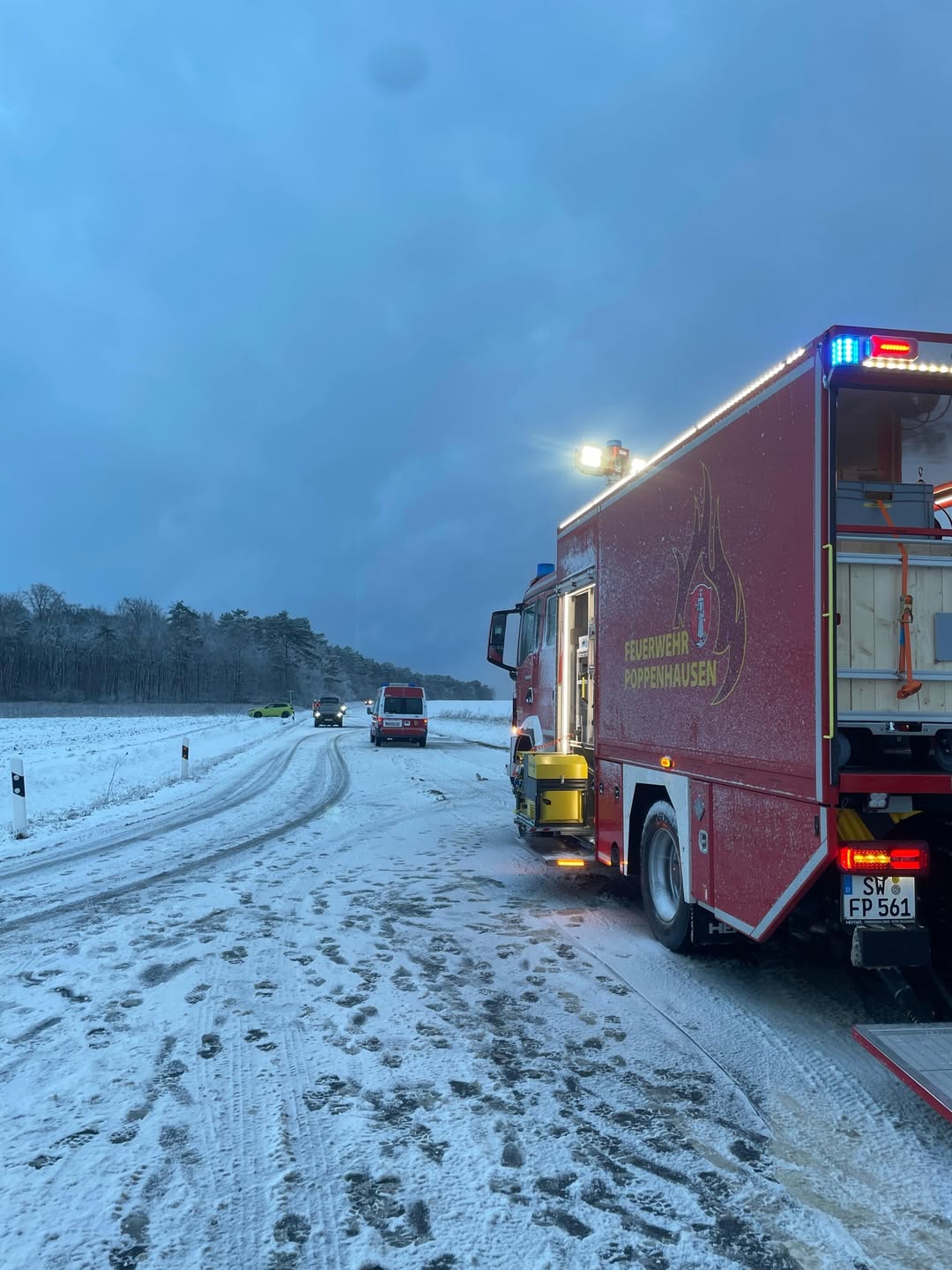 Am 02. Januar wurden wir gegen 07:48 Uhr gemeinsam mit den Feuerwehren Hambach, Dittelbrunn und Holzhausen zu einem THL 3 – Person eingeklemmt auf die Kreisstraße SW 8 alarmiert.